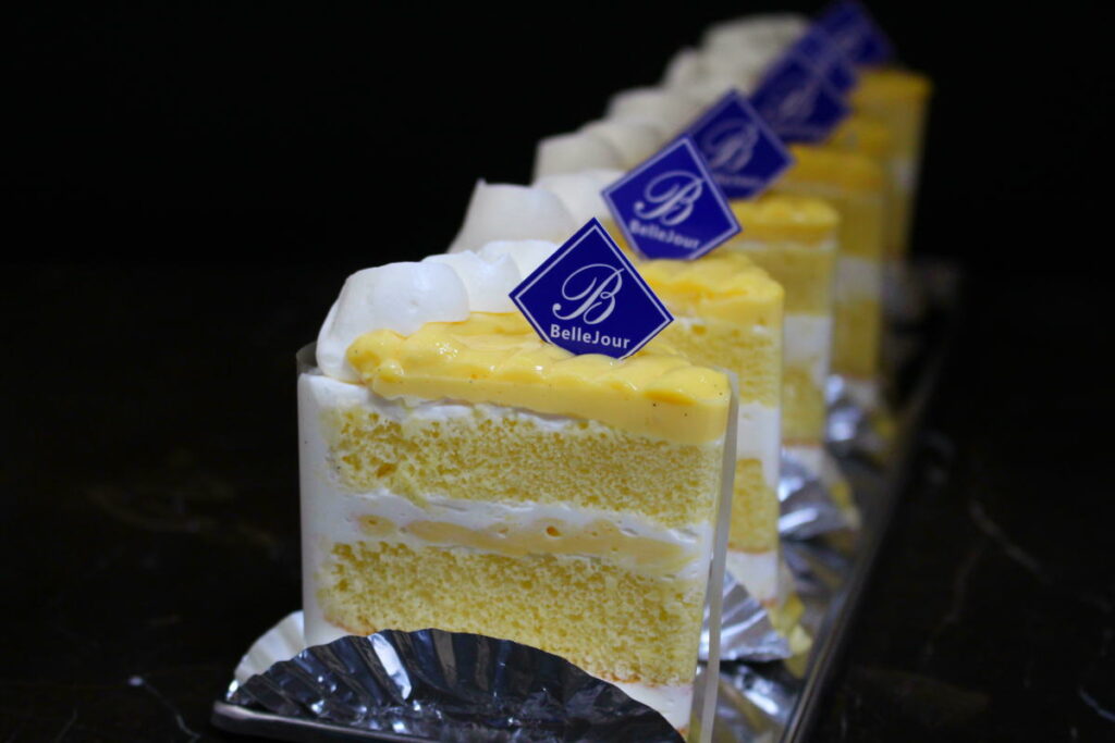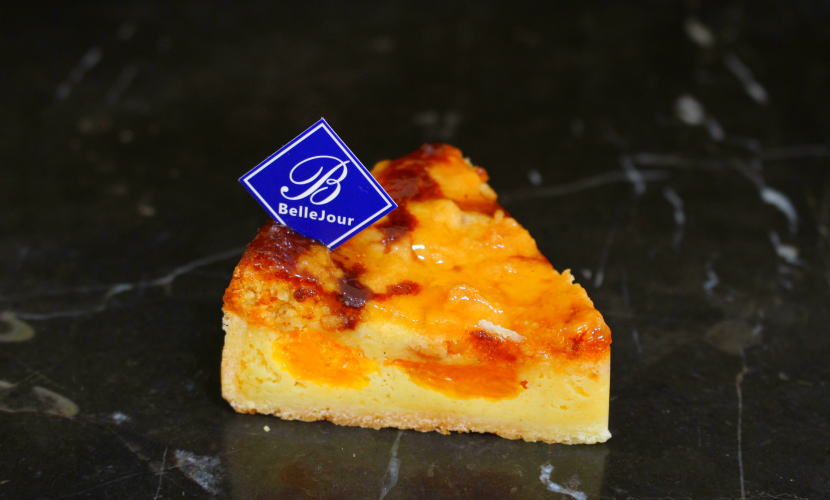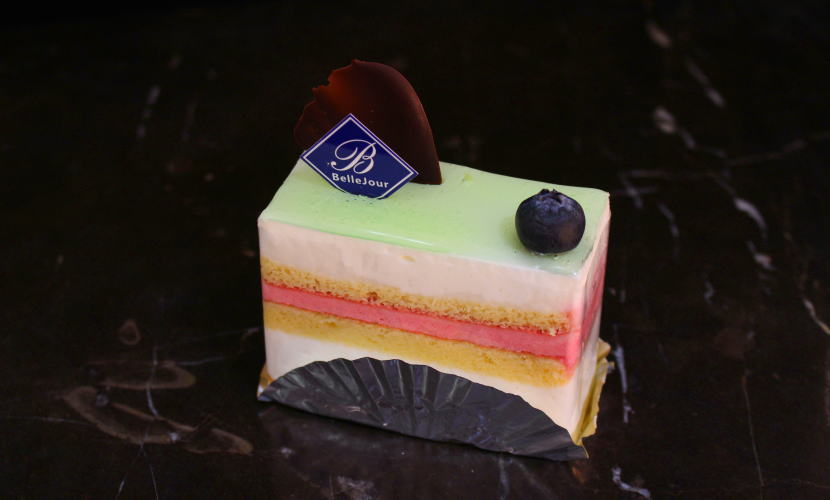 オペラという名のフランス菓子をピラミッド形に変えて作りました。コーヒーのシロップと染み込ませたスポンジに、濃厚ガナッシュクリームと卵黄とバターで仕上げたコーヒークリームを重ねました。表面にはチョコレートをスプレーガンで噴霧して仕上げました。